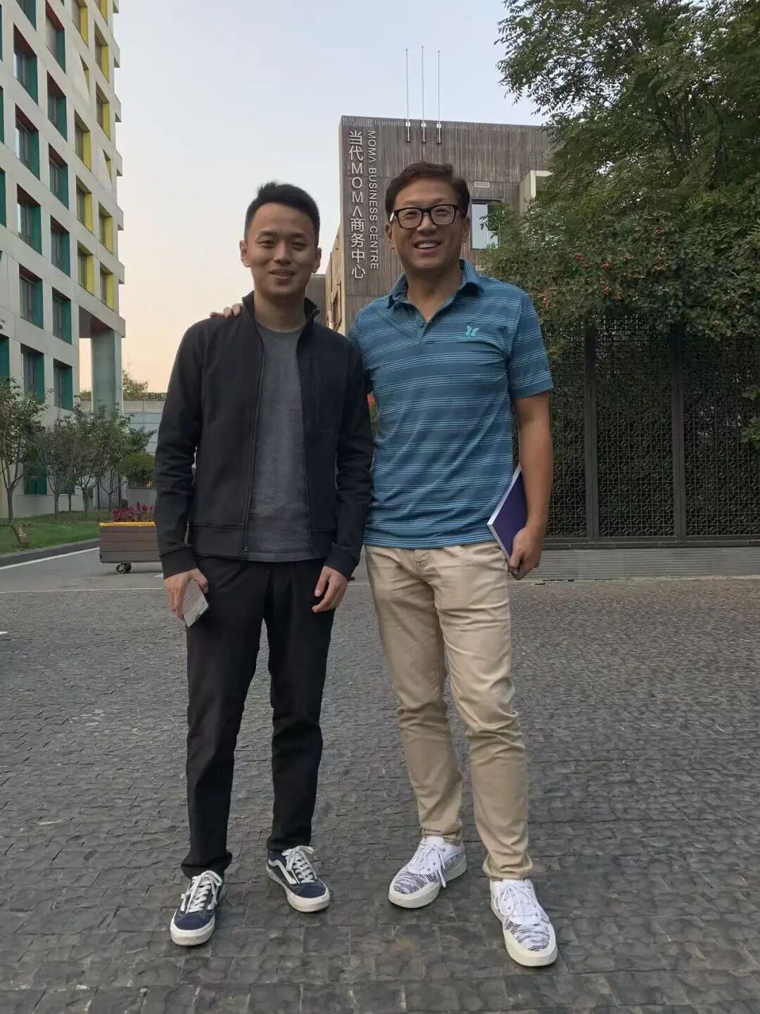 李熠(左)与曹大容(右),2019年摄于51WORLD办公室楼前